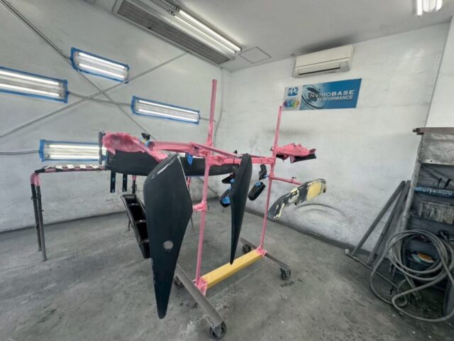 下地調整を行い、黒から白にボディの色を変えて青ラインの塗装、ステッカーを貼って完成予定です!